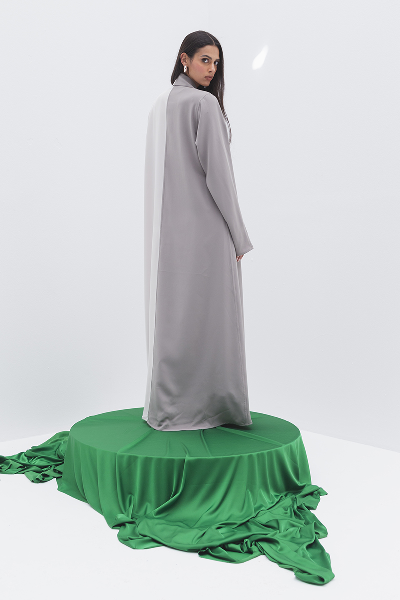 Color blocked crepe denim style A line skirt with pockets. This garment is made to order, allow 3 – 4 weeks for production and shipping.