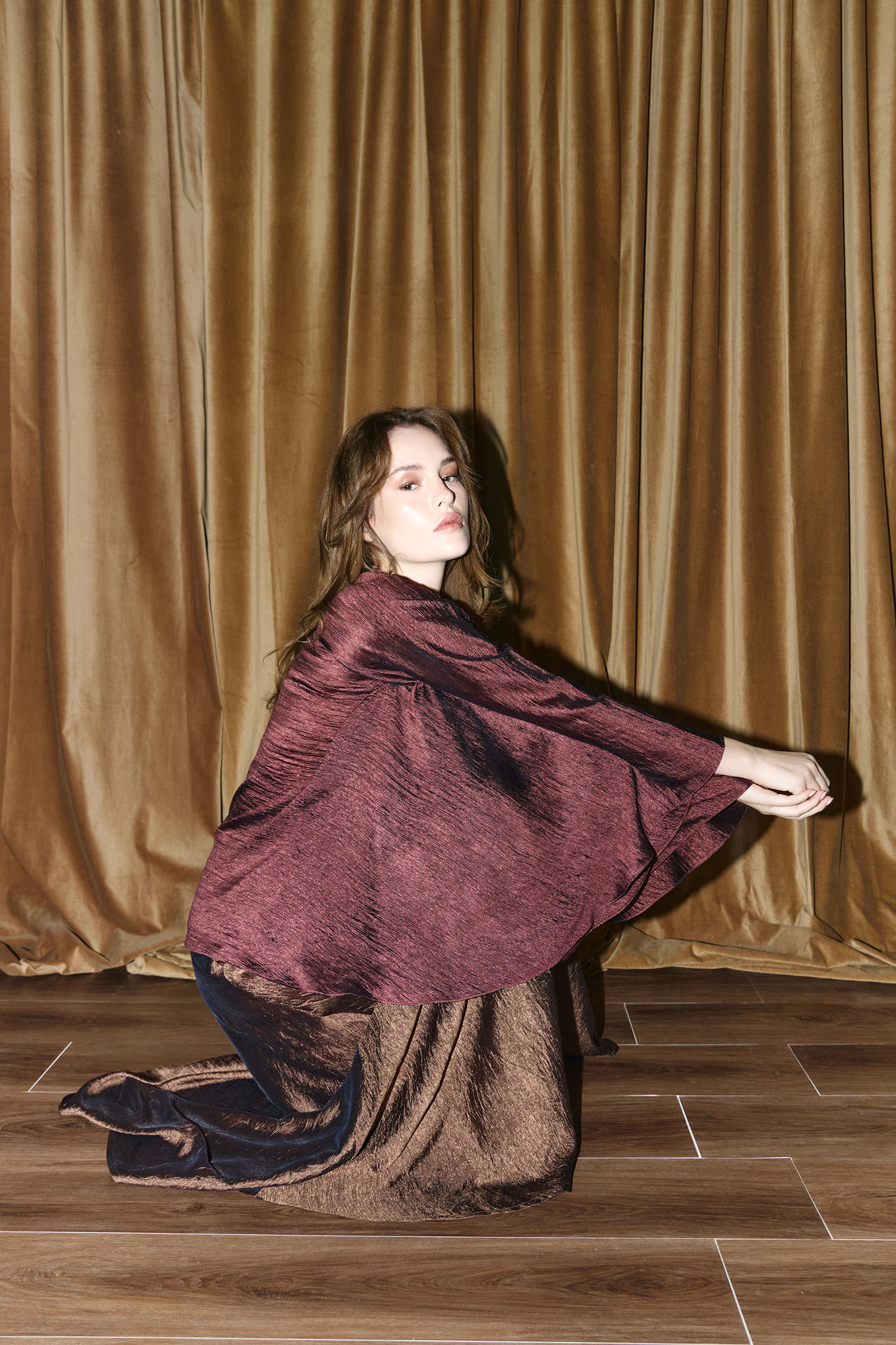 Ultra fluid textured crepe blouse with sculpted sleeve and waist line. This garment is made to order. Kindly allow 4 – 6 weeks for production and shipping