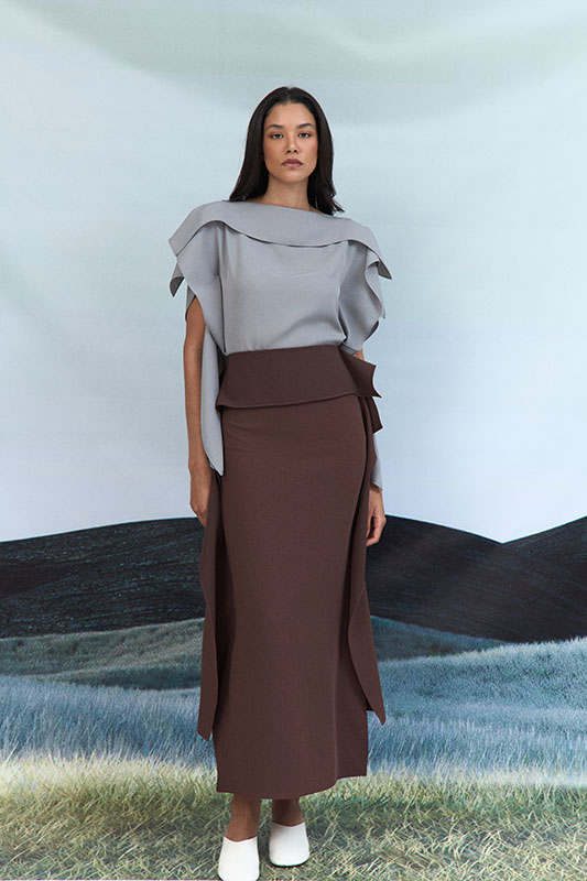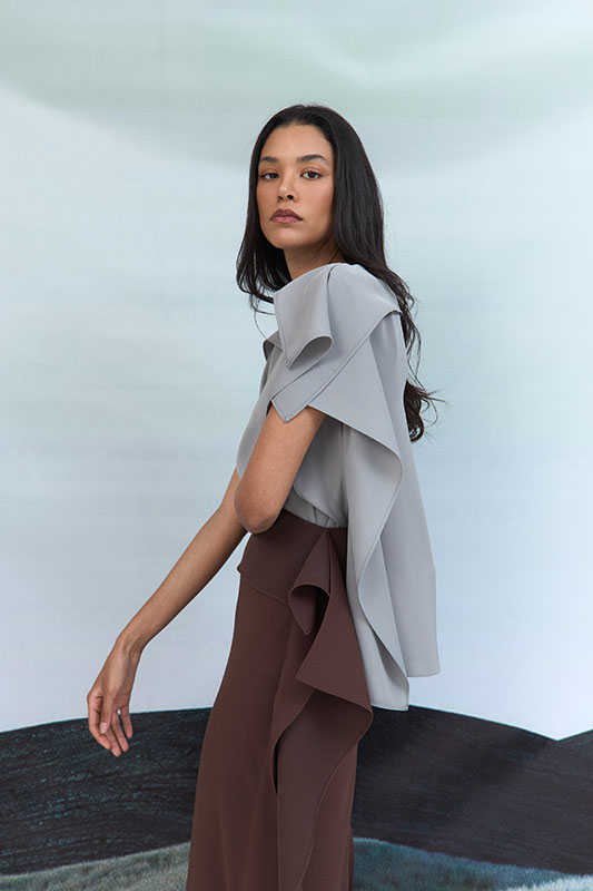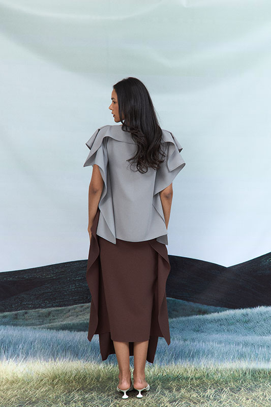 High-low crepe skirt with overlap design. This garment is made to order, kindly allow 4 – 6 weeks for production and shipping.