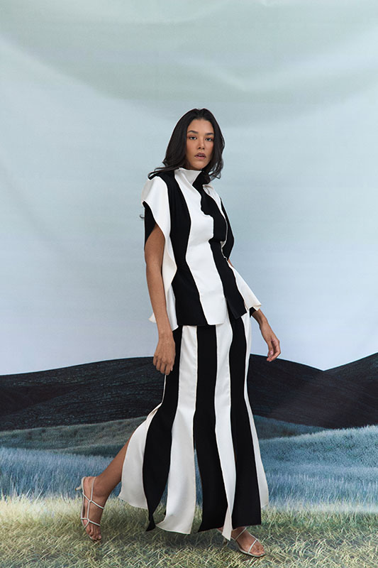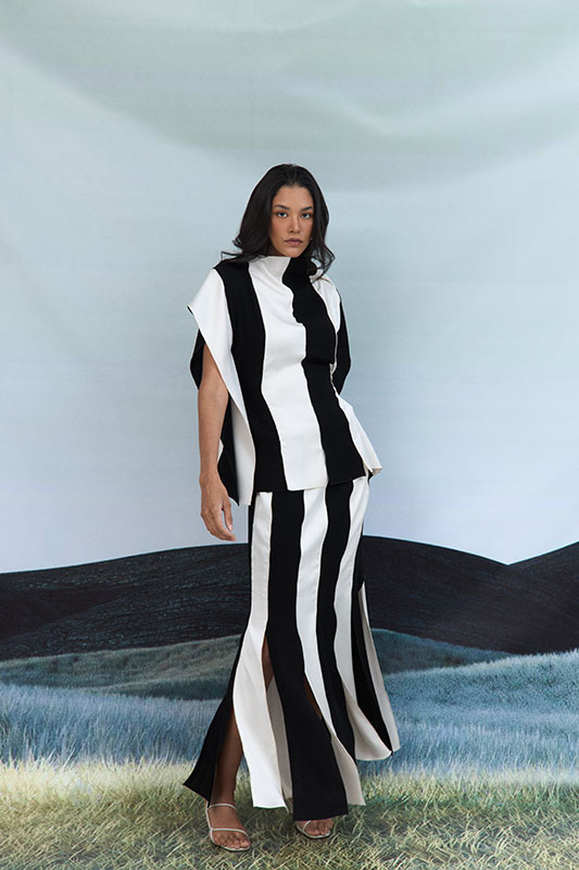 Deconstructed crepe skirt with multiple slits. This garment is made to order, kindly allow 4 – 6 weeks for production and shipping.