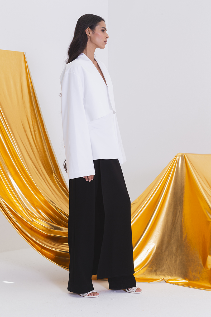 Double layered poplin shirt with hidden button and slightly flared sleeves. This garment is made to order, allow 3 – 4 weeks for production and shipping.