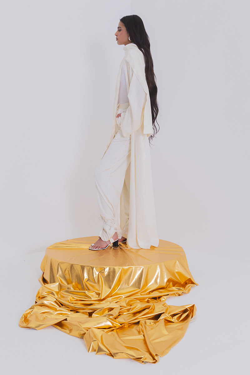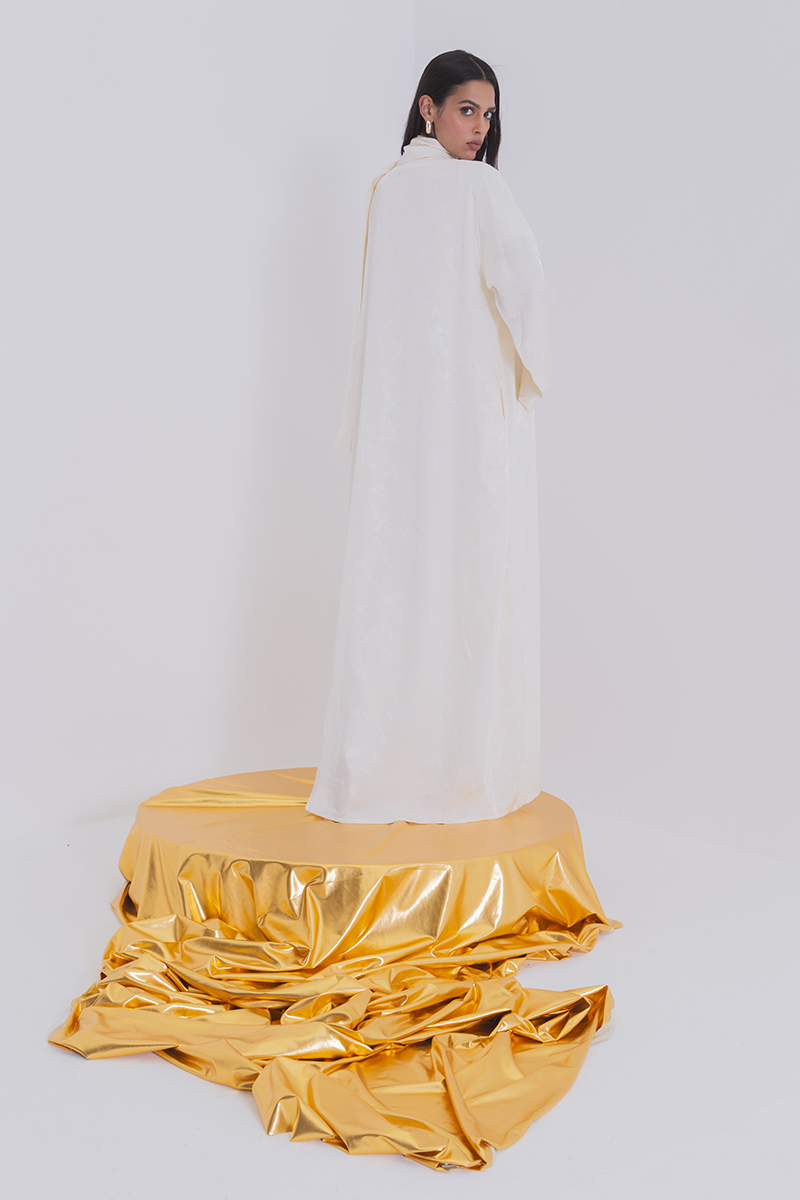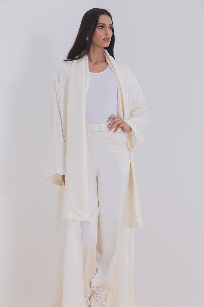 Embosed floral print silk abaya with a knee length lapel attached around the neck. This garment is made to order, allow 3 – 4 weeks for production and shipping.