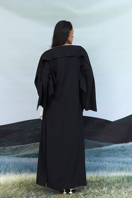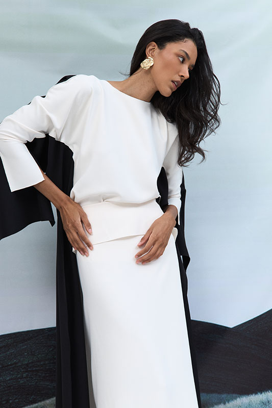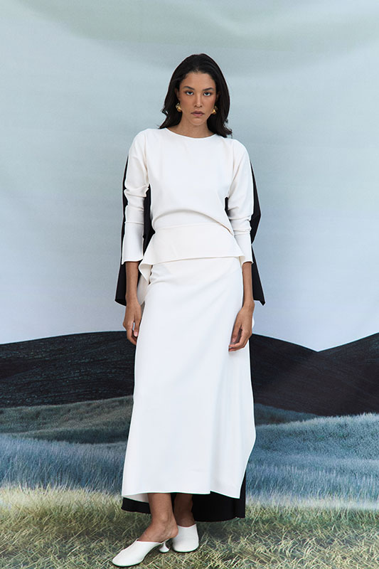 Color blocked crepe high-low design blouse with overlay details. This garment is made to order, kindly allow 4 – 6 weeks for production and shipping.