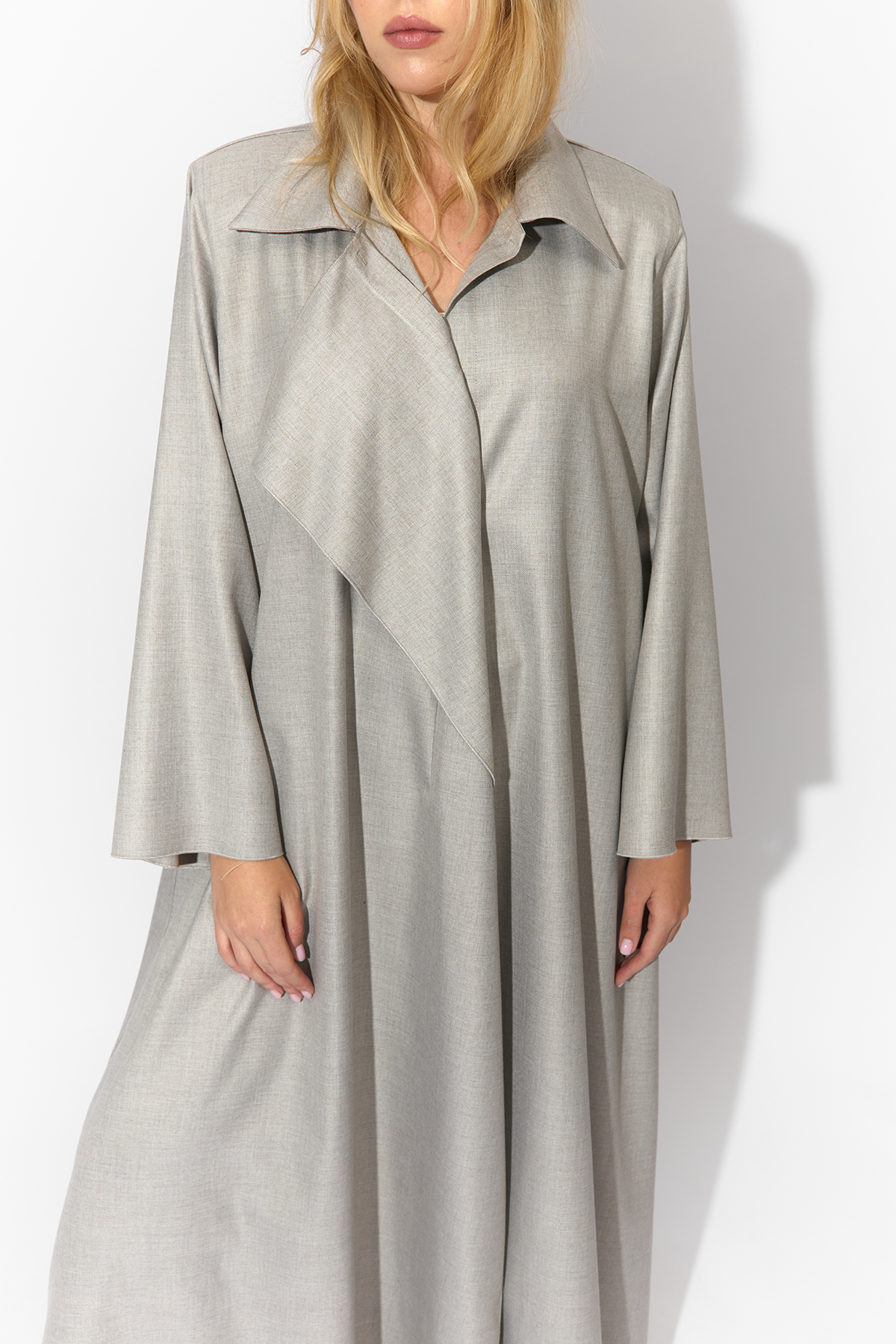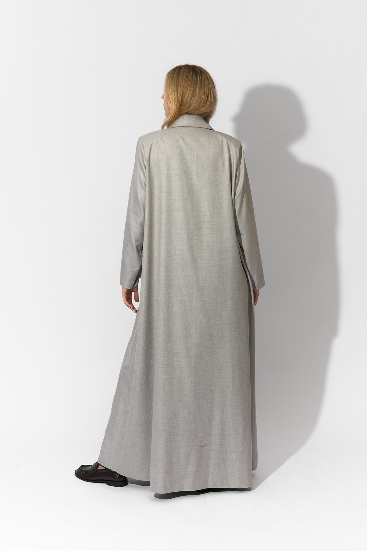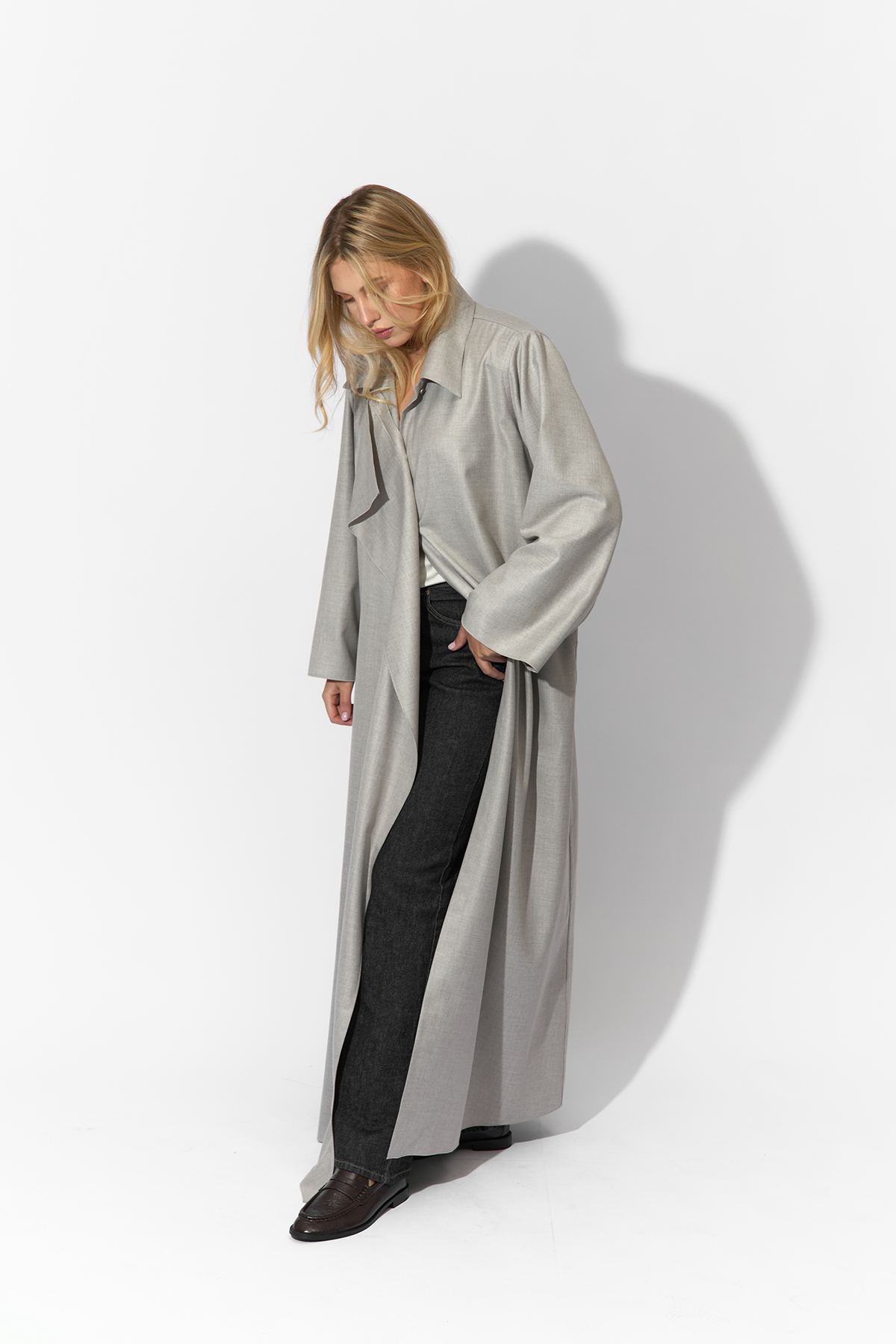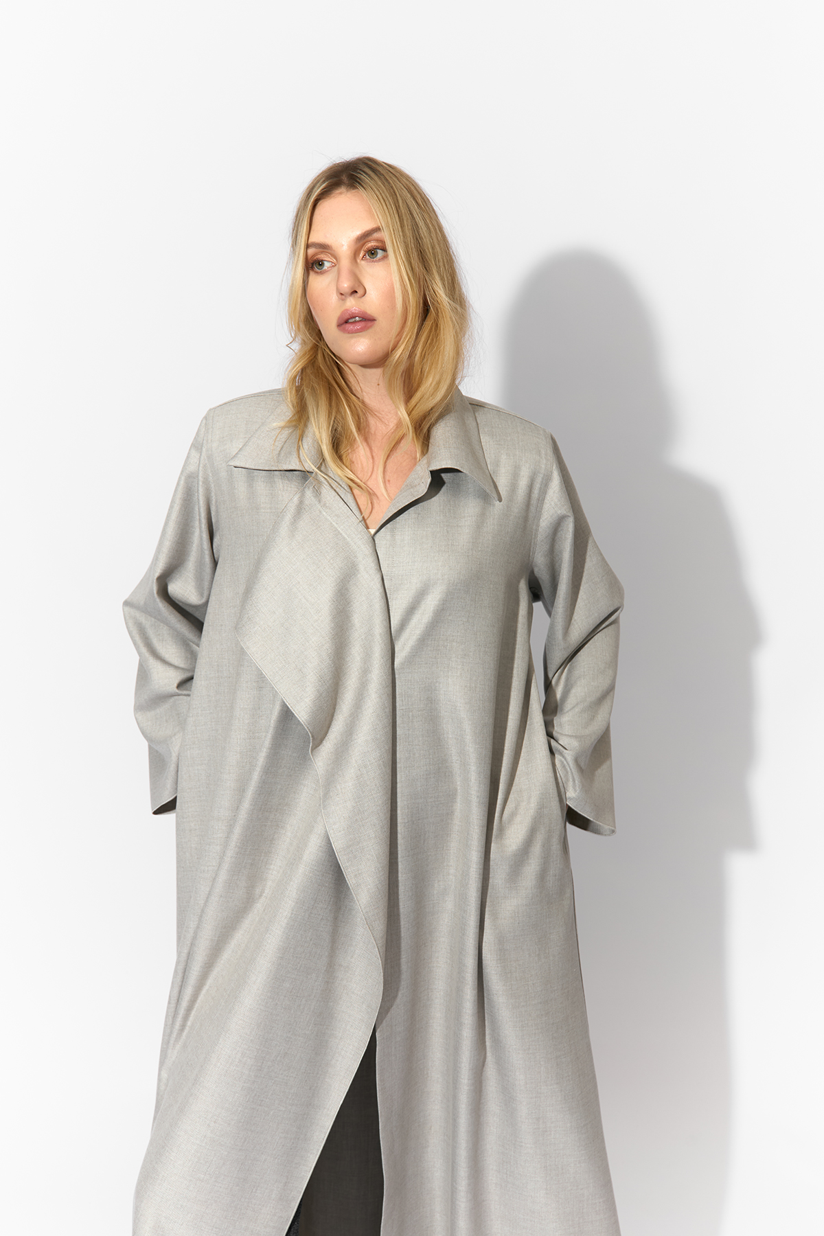 Cashmere blend shirt style jacket with front buttoned drape design and shoulder pads.