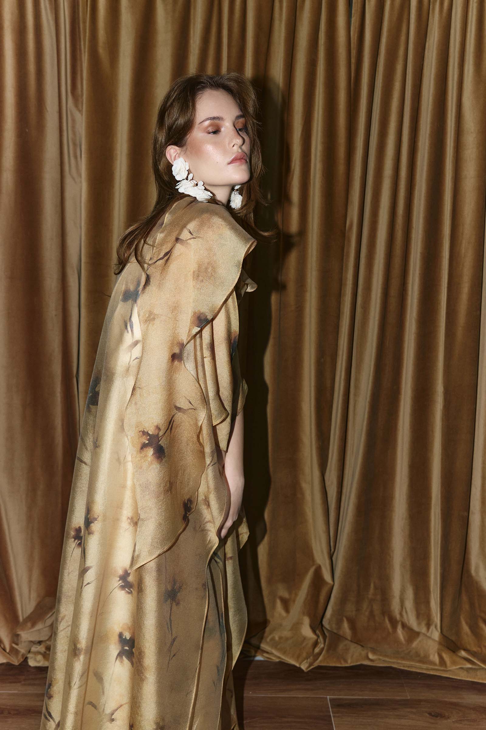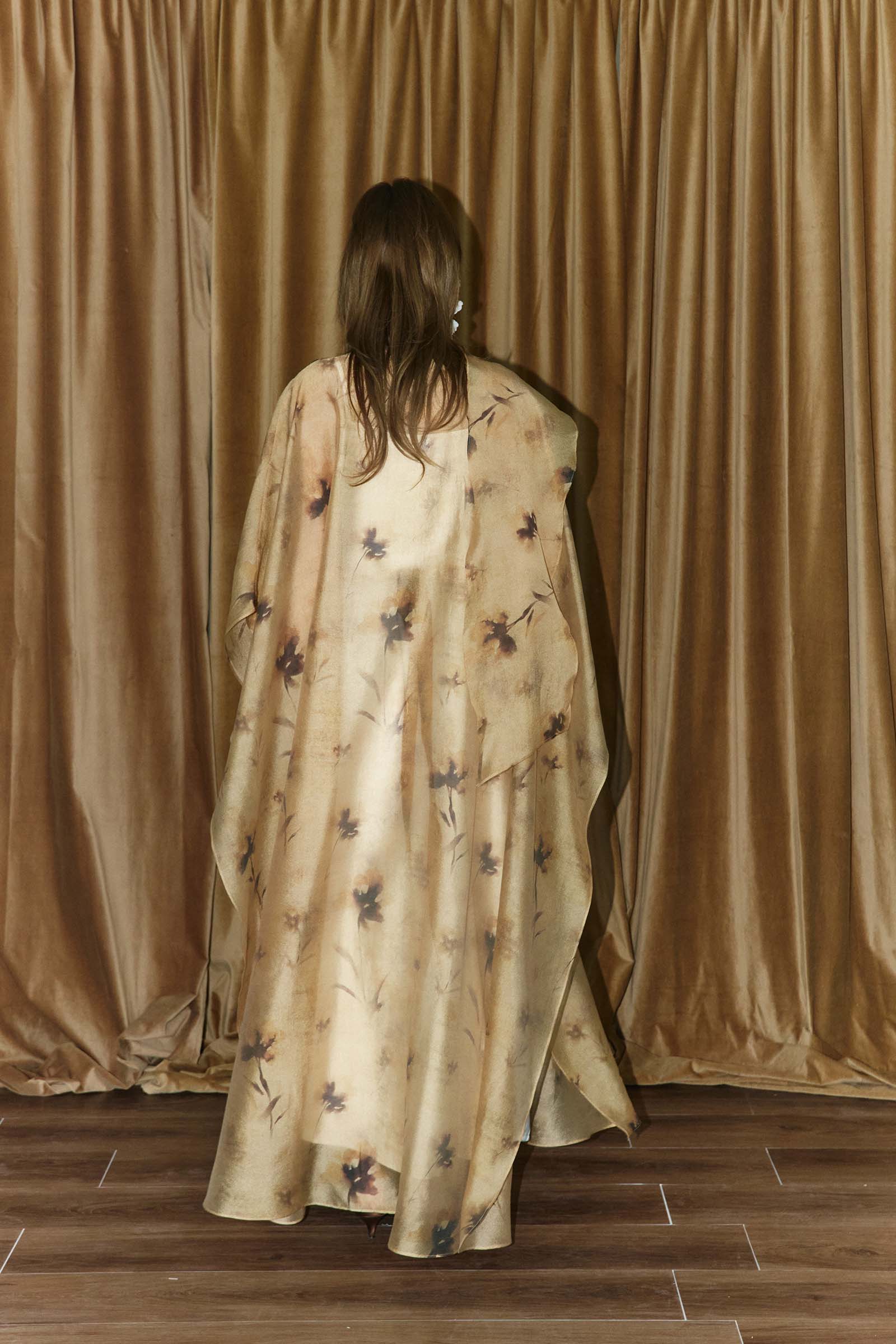 Printed organza kaftan with inner belts and a shoulder scarf, paired with a creme crepe underdress. This garment is made to order. Kindly allow 4 – 6 weeks for production and shipping.