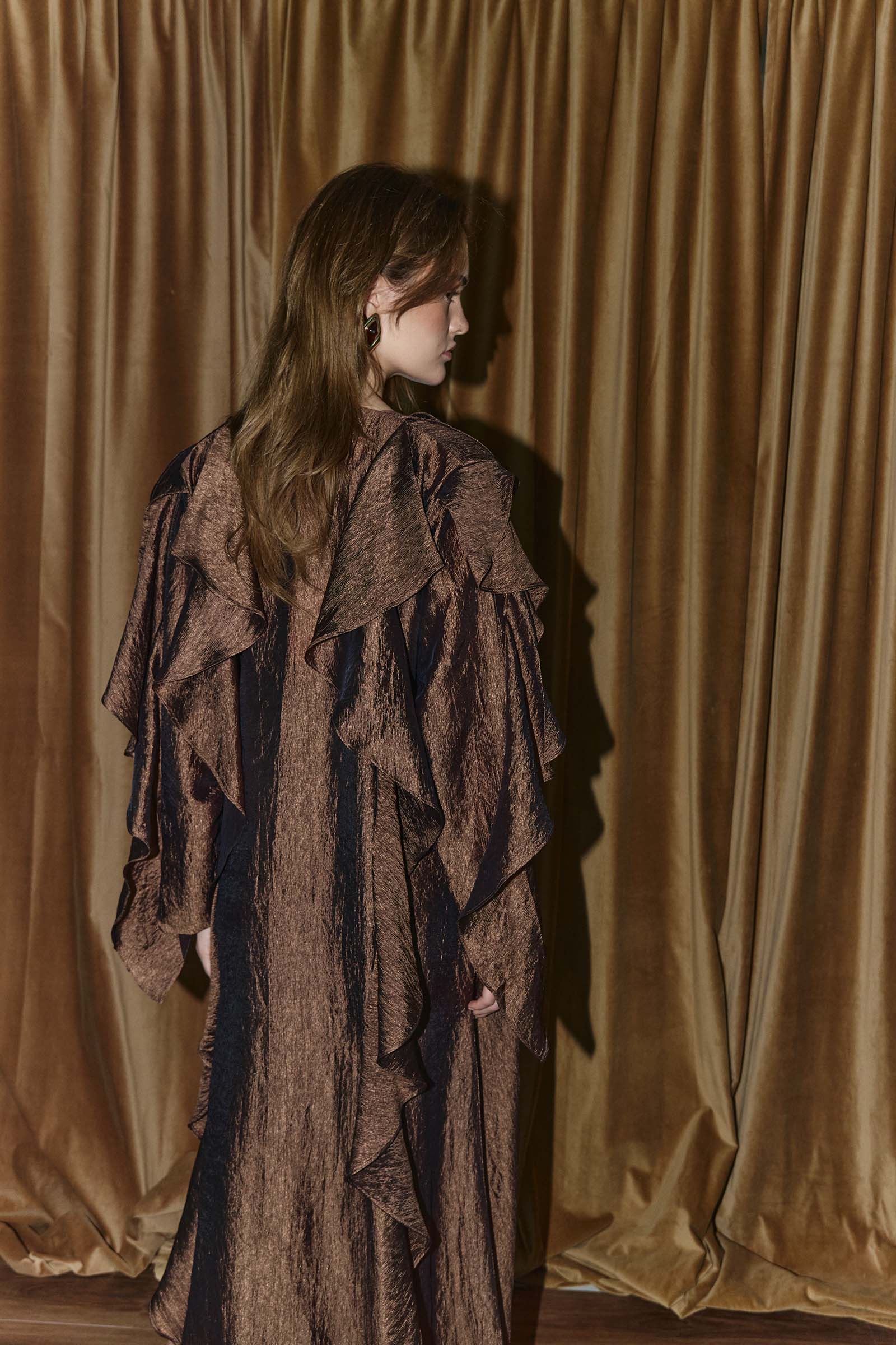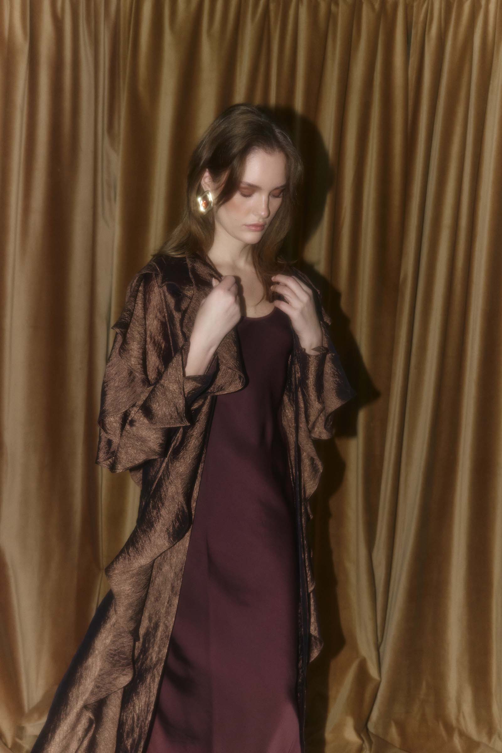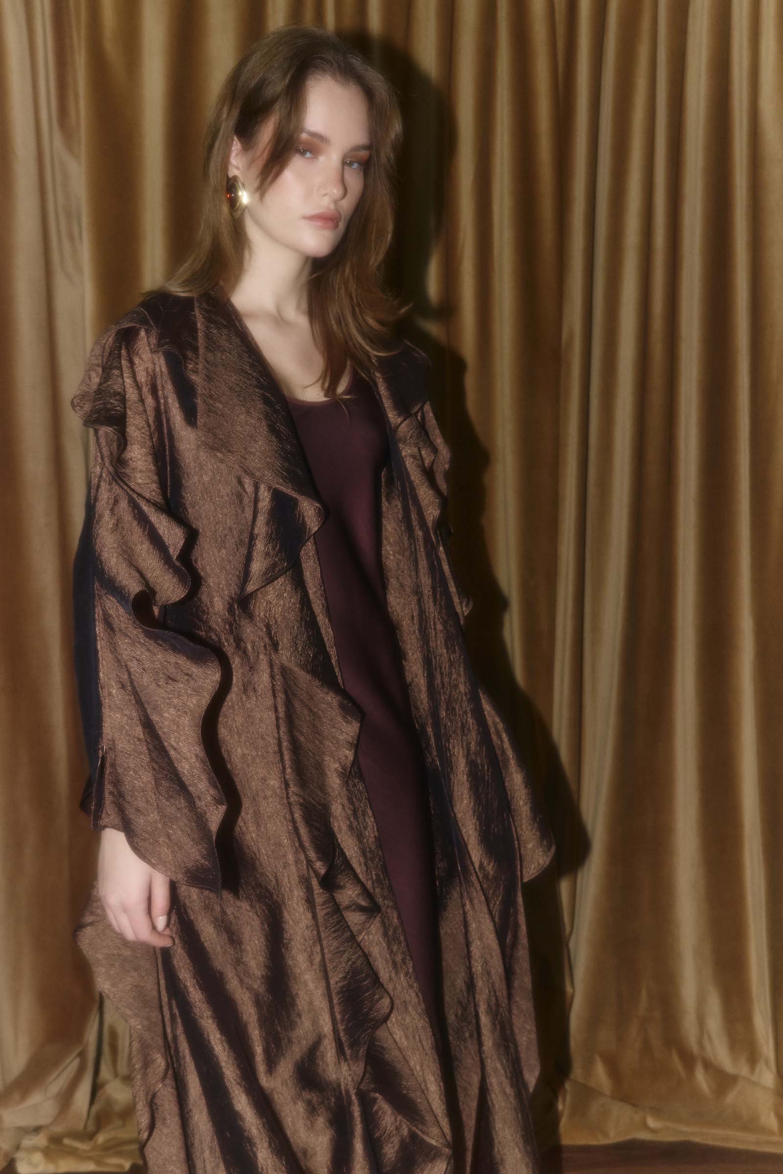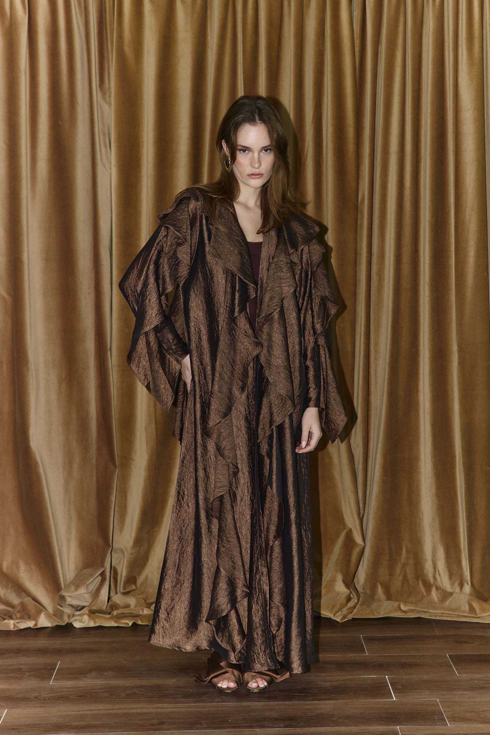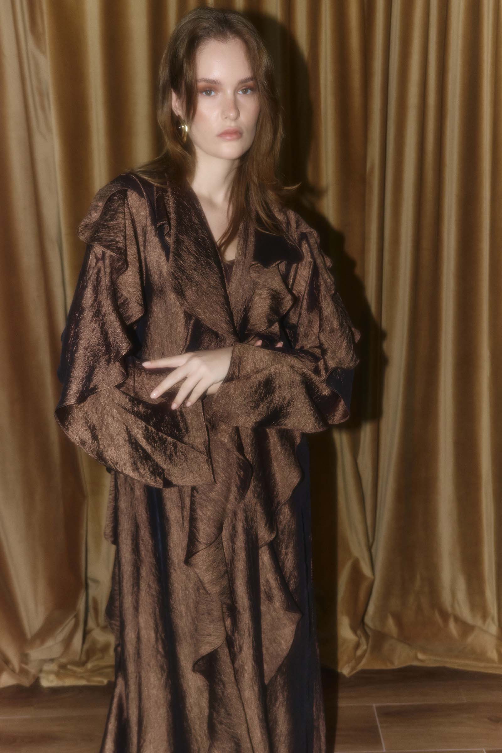 Ultra fluid textured crepe abaya with cascading ruffle panels. This garment is made to order. Kindly allow 4 – 6 weeks for production and shipping.