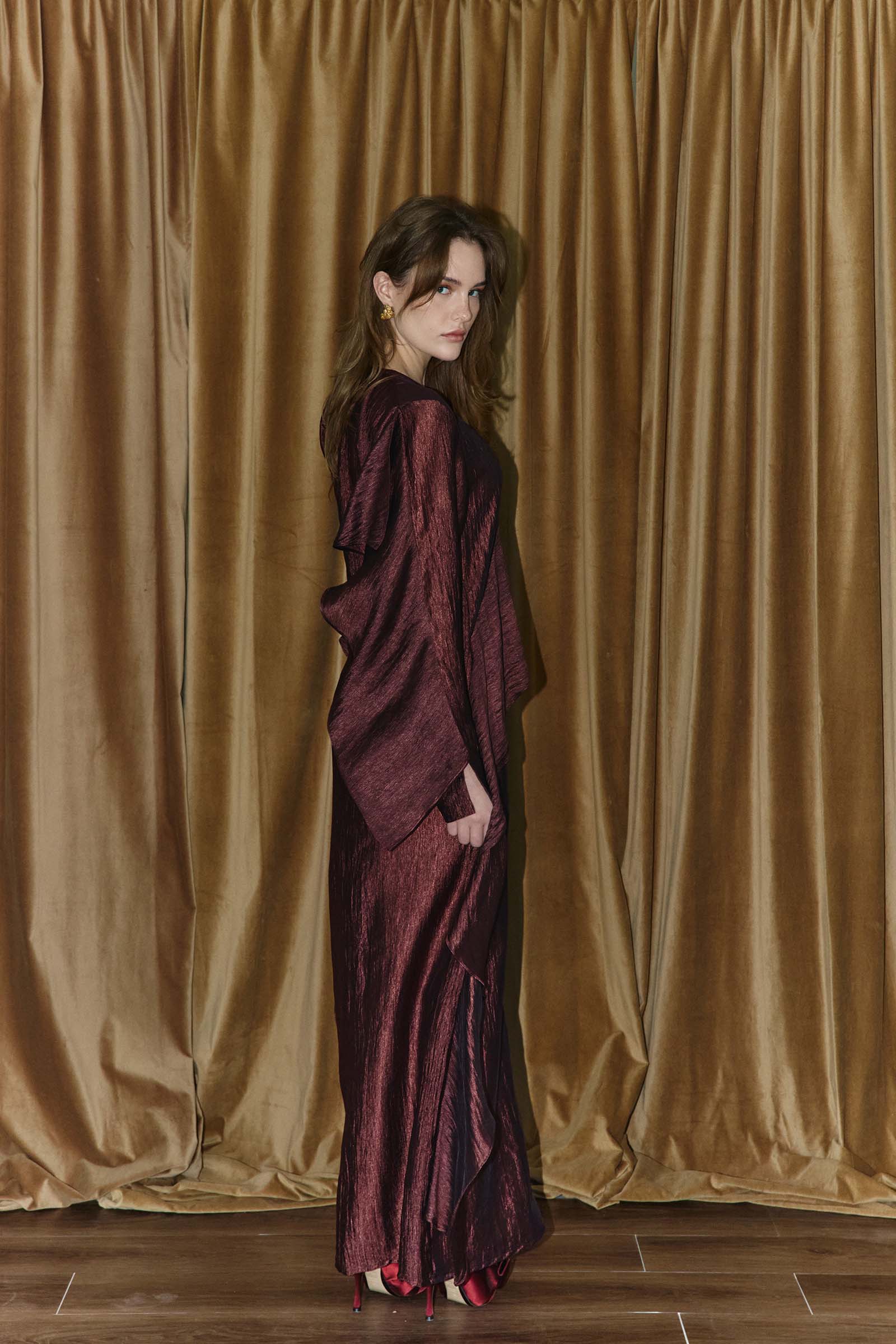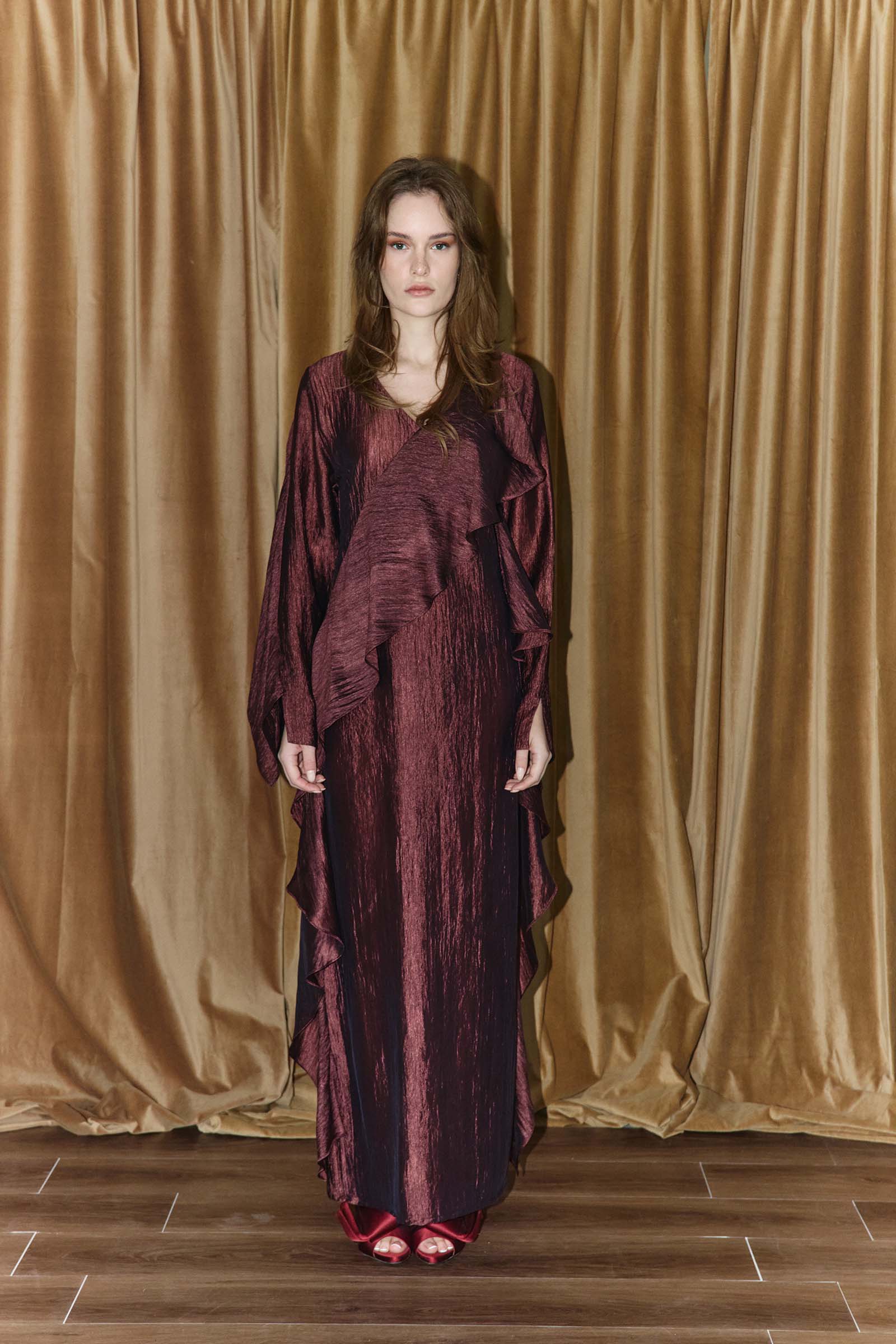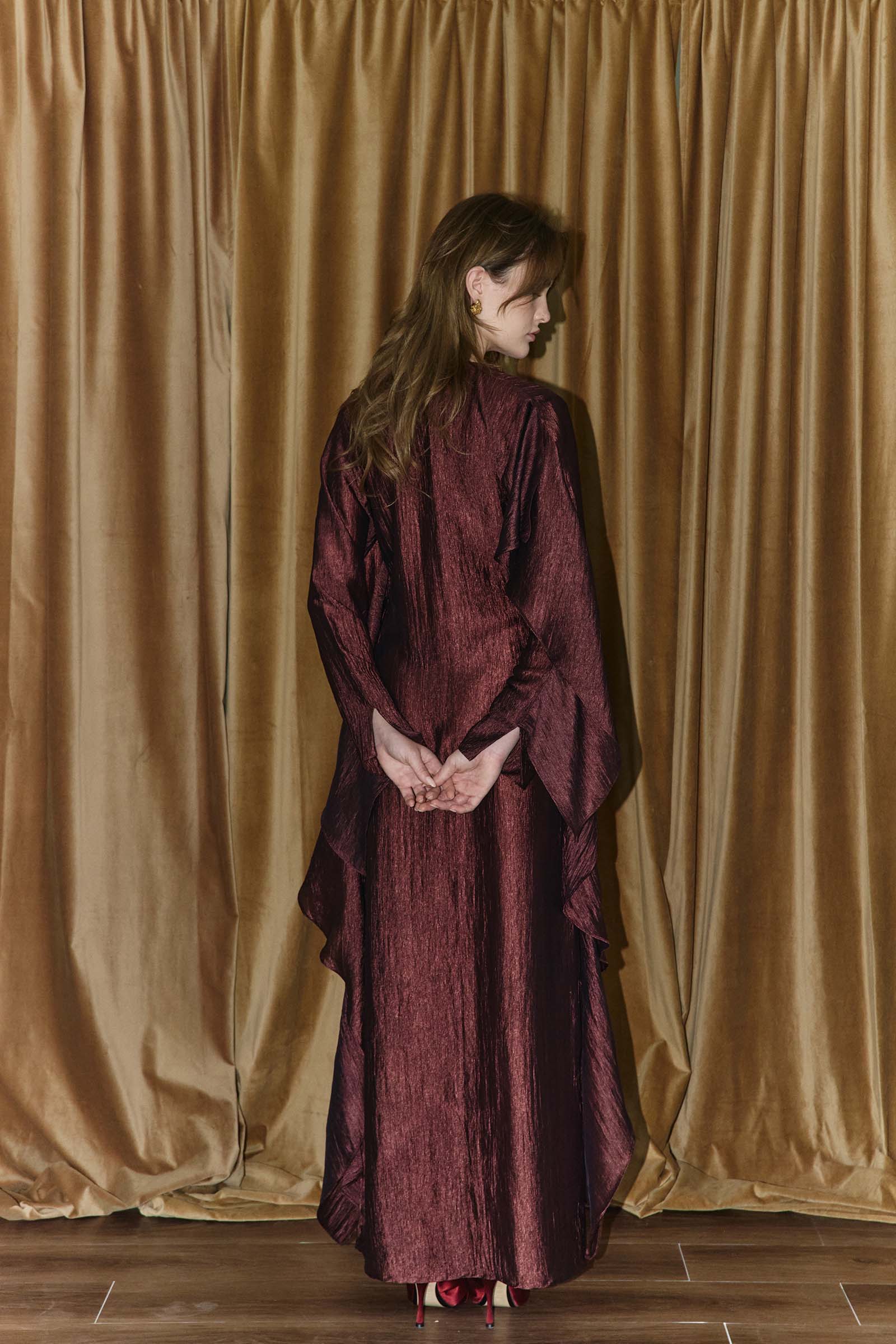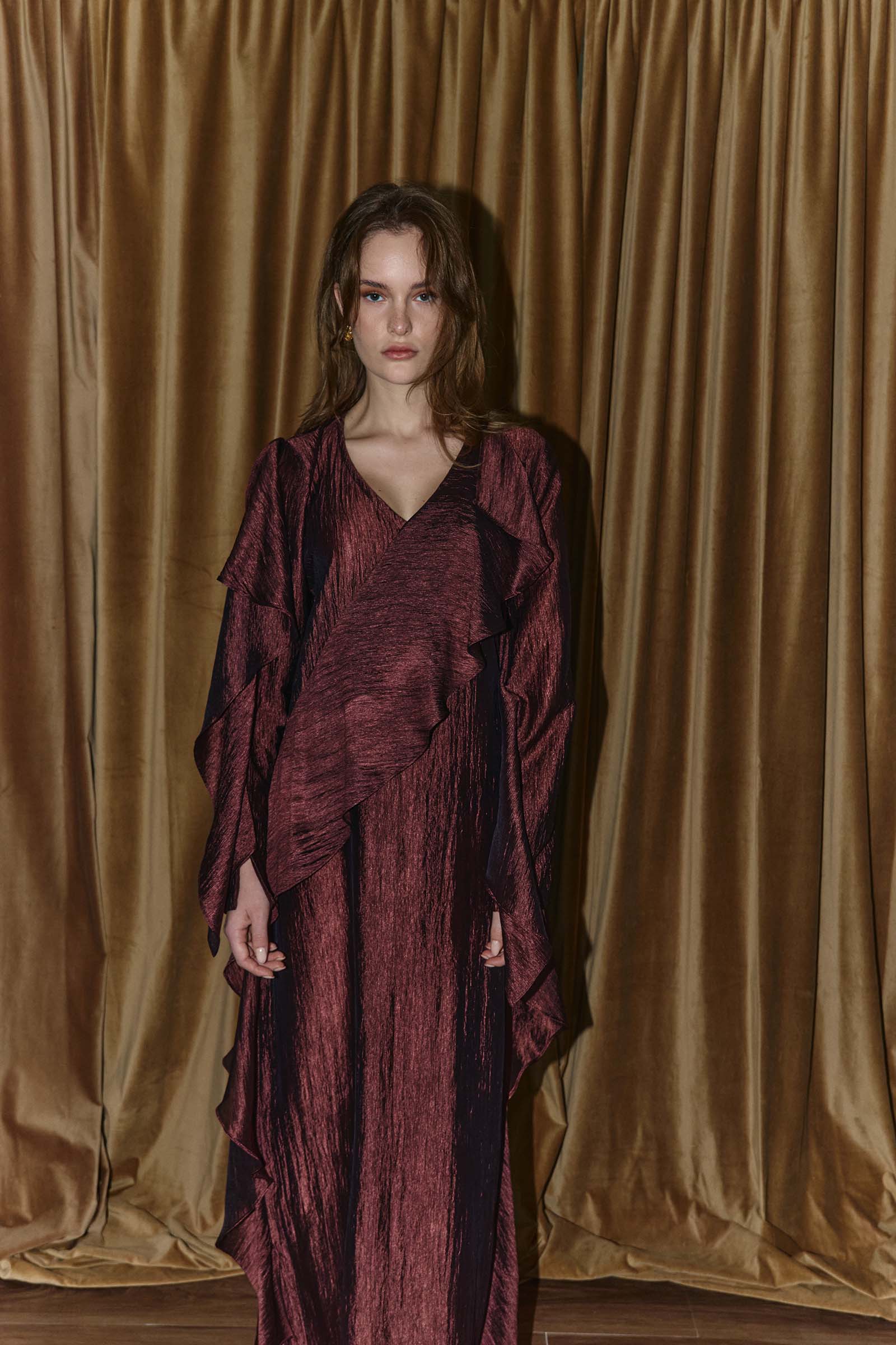 Ultra fluid textured crepe dress with cascading ruffle panels. This garment is made to order. Kindly allow 4 – 6 weeks for production and shipping.