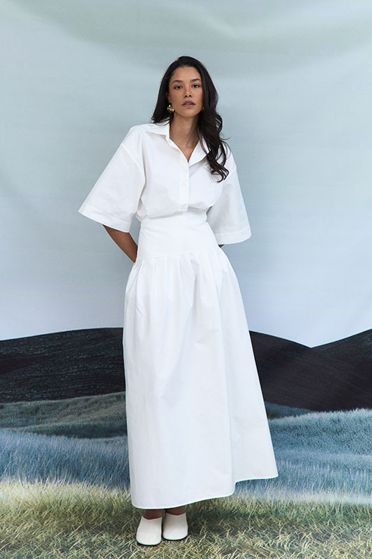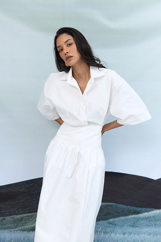 Poplin hip hugging pleated skirt. This garment is made to order, kindly allow 4 – 6 weeks for production and shipping.