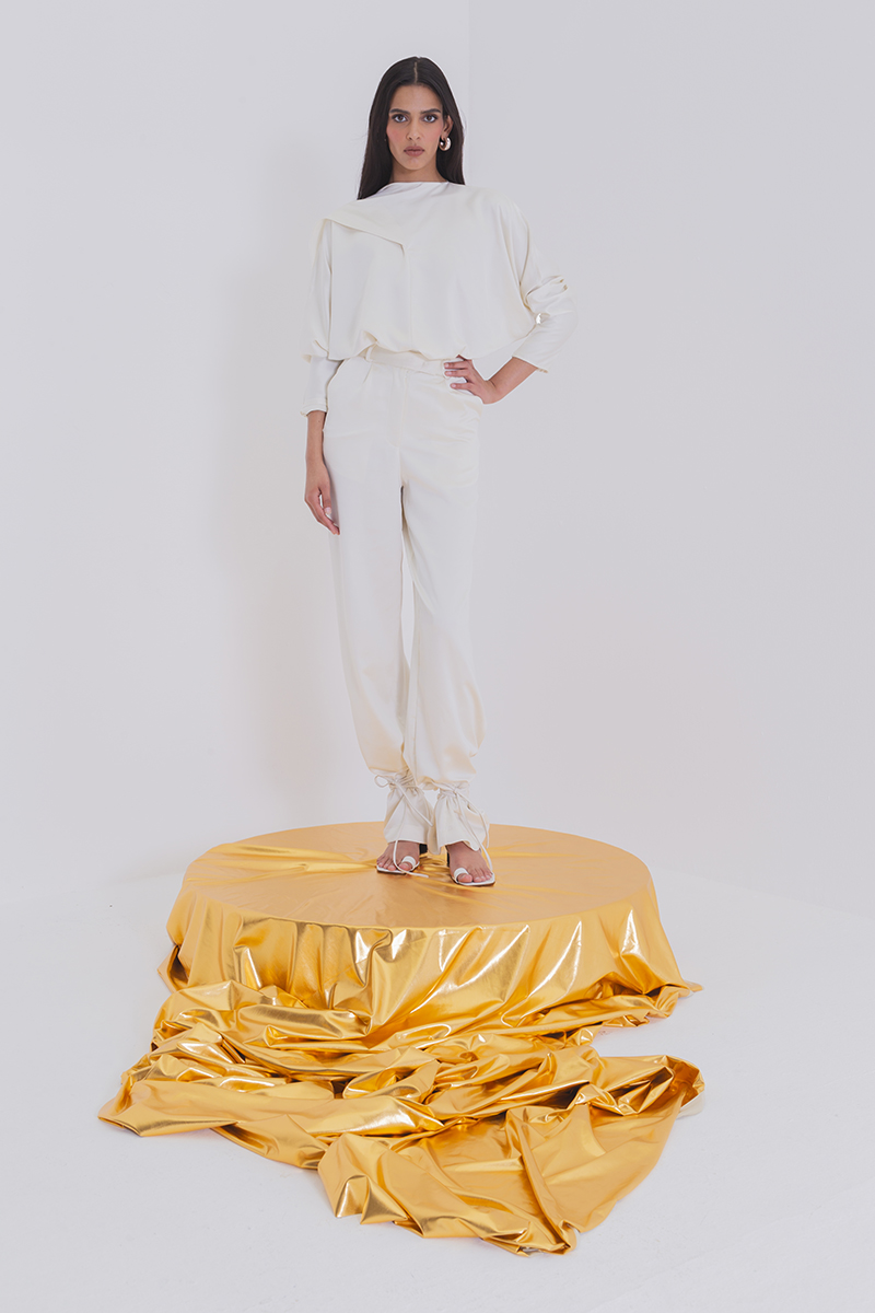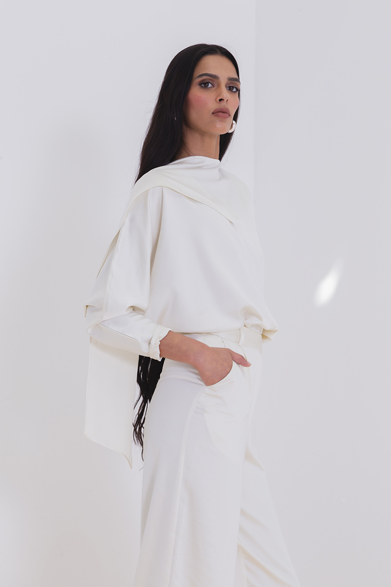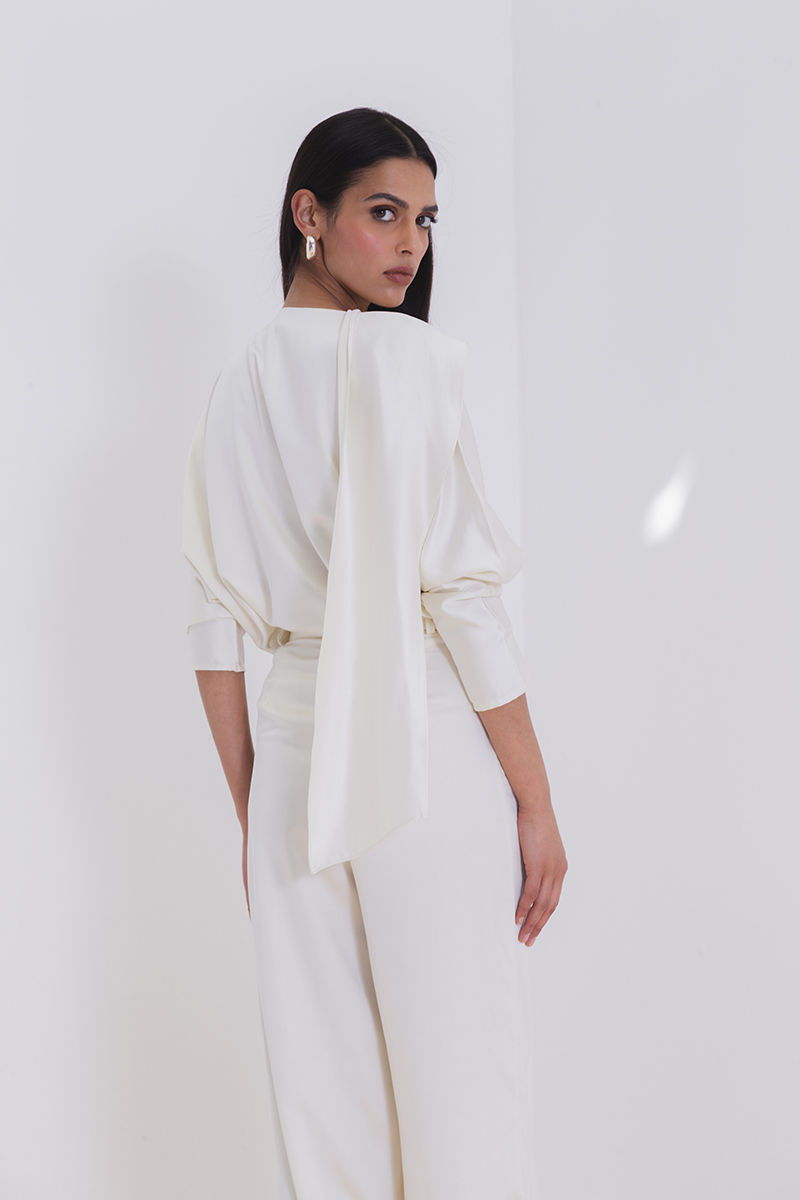 Satin silk blouse with draped neck scarf. This garment is made to order, allow 3 – 4 weeks for production and shipping.