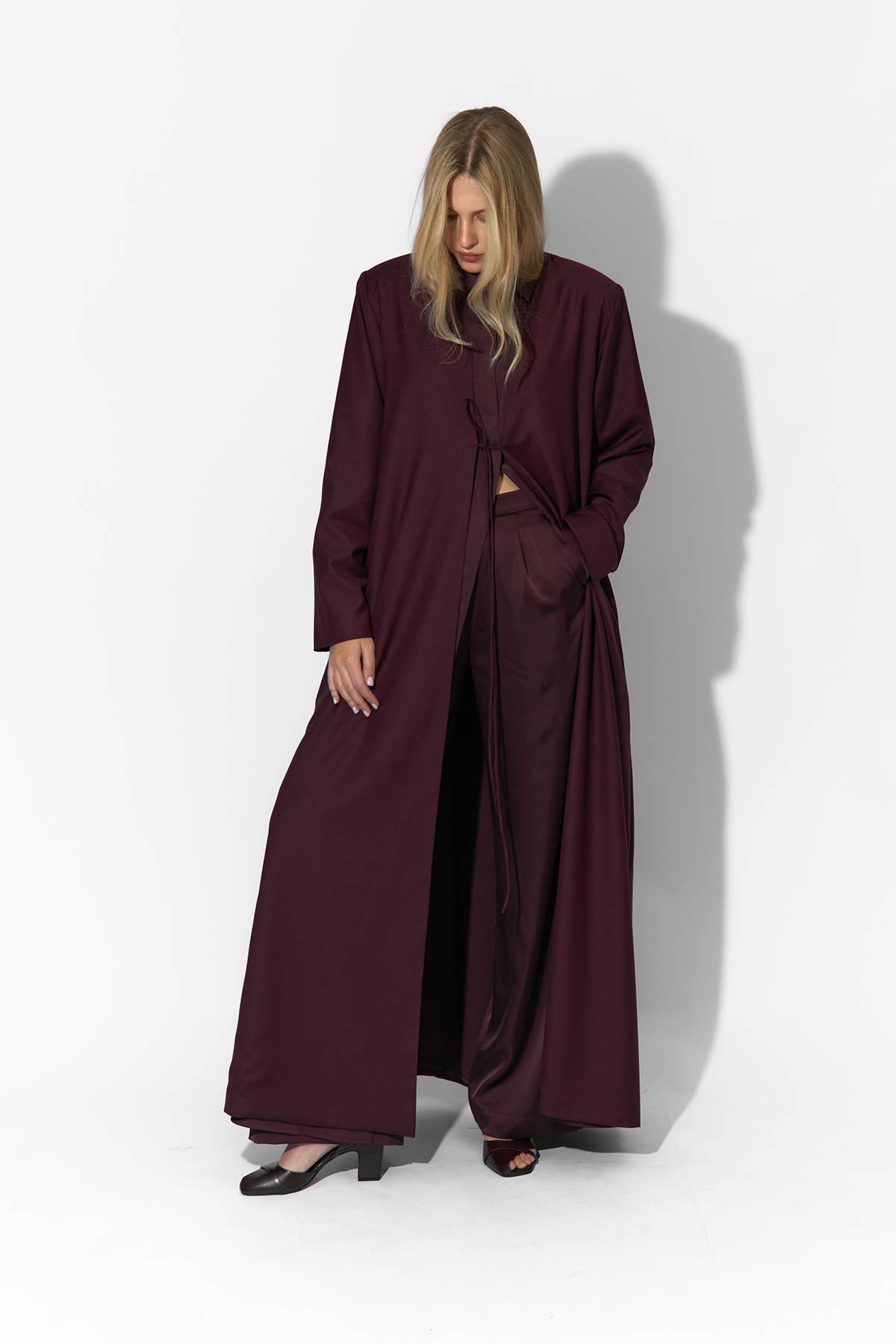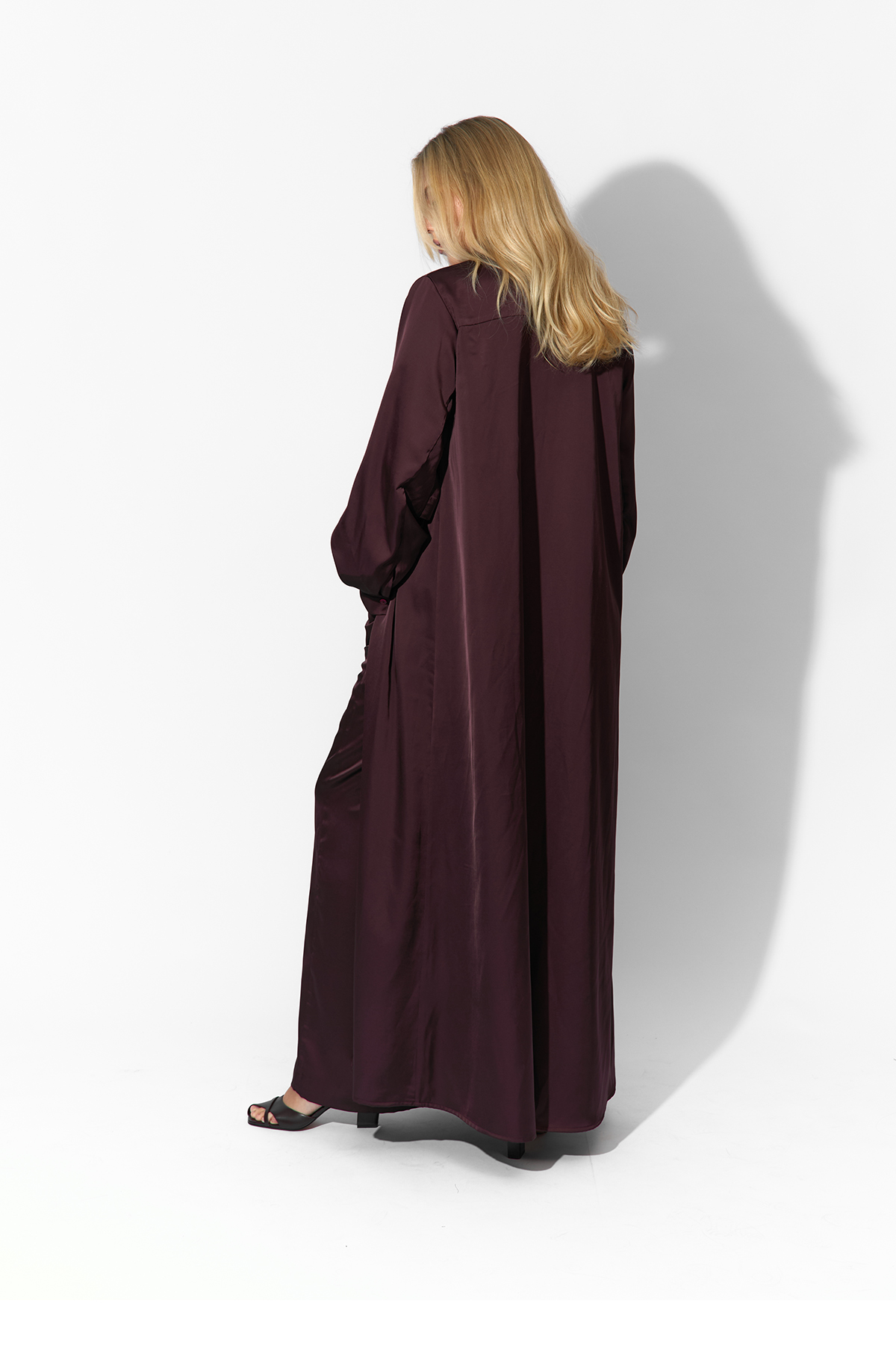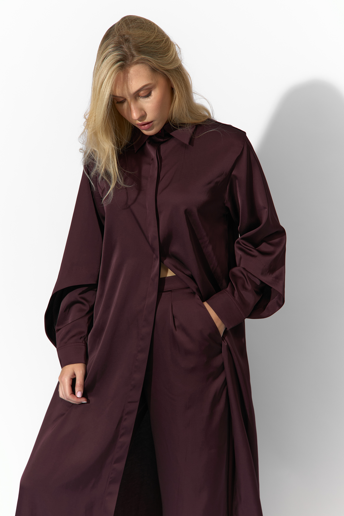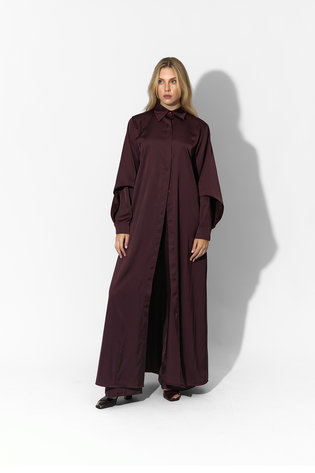 Silk crepe maxi shirt with sleeve overlay detail and front buttons, paired with matching tailored pants.