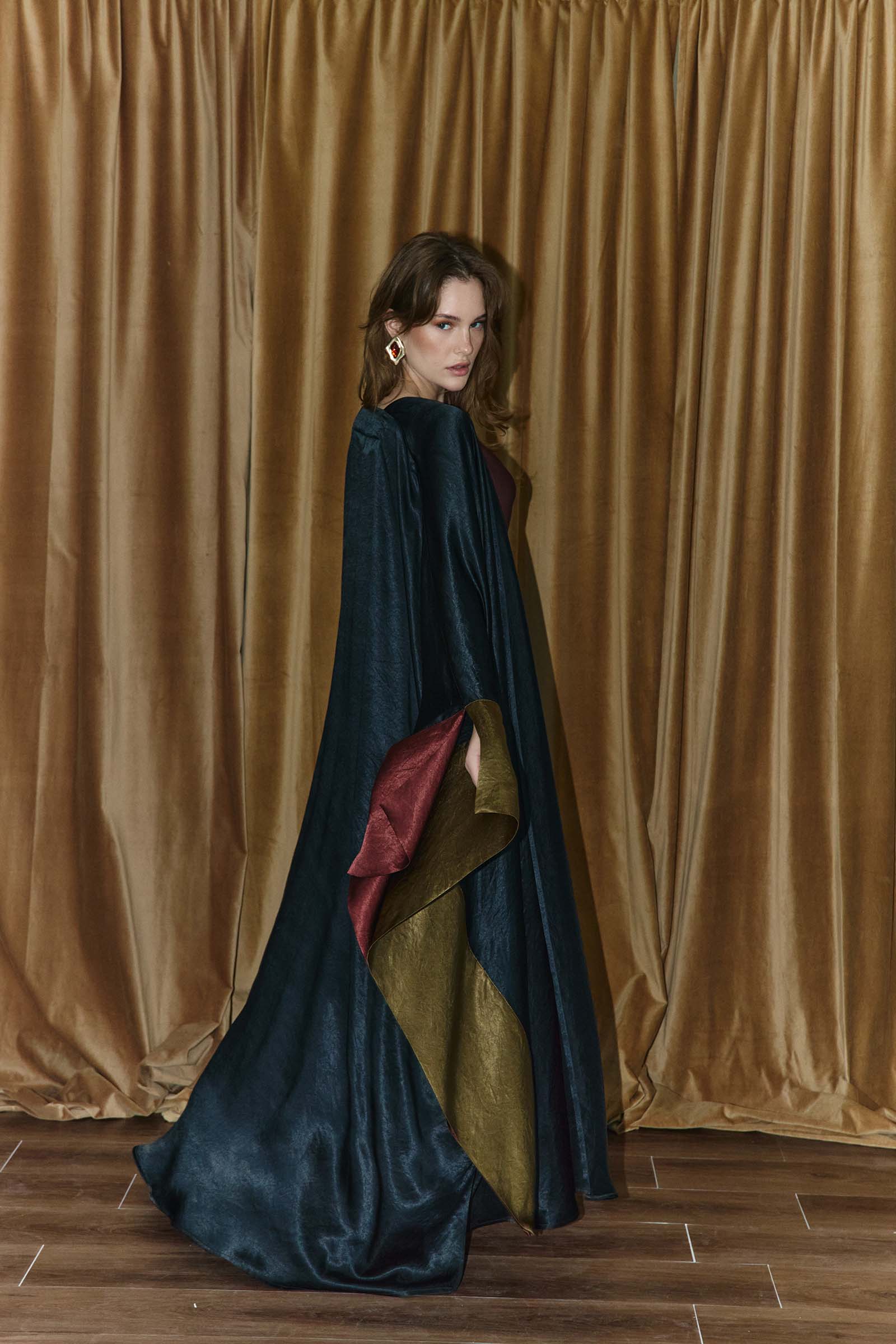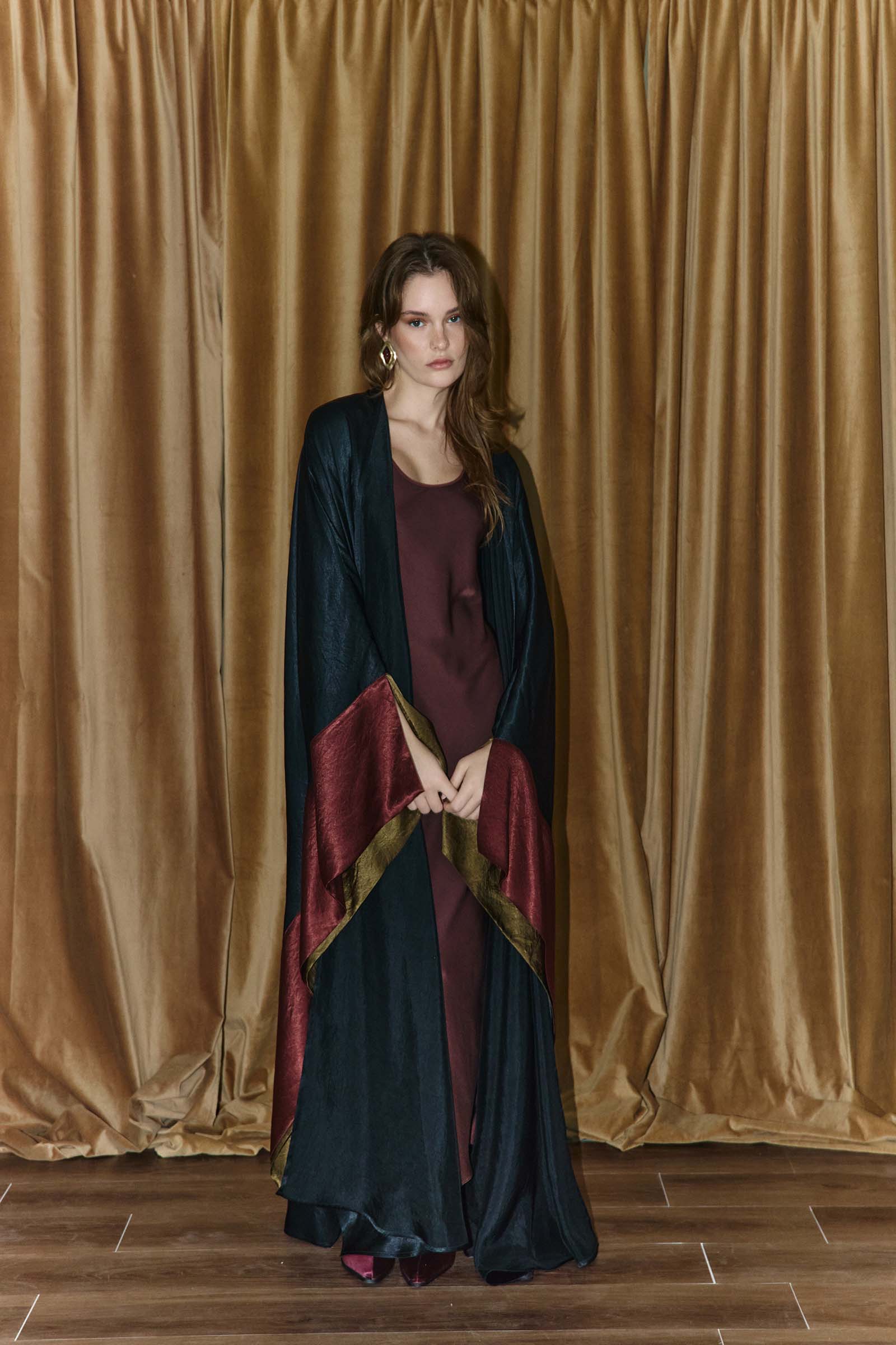 Silk satin best style abaya with color-blocked slit sleeves. This garment is made to order. Kindly allow 4 – 6 weeks for production and shipping.