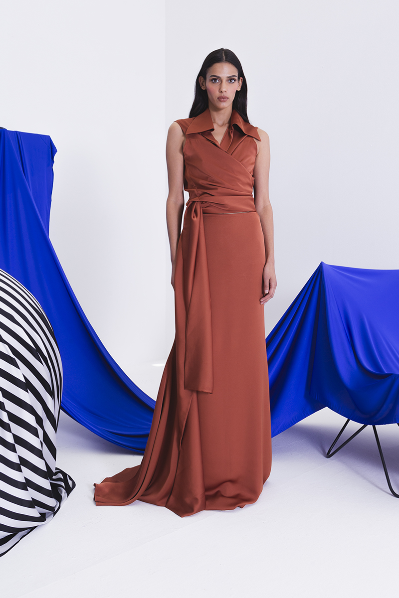 Sleeveless crepe satin shirt with extra long belts designed to be wrapped around the waist line. This garment is made to order, allow 3 – 4 weeks for production and shipping.