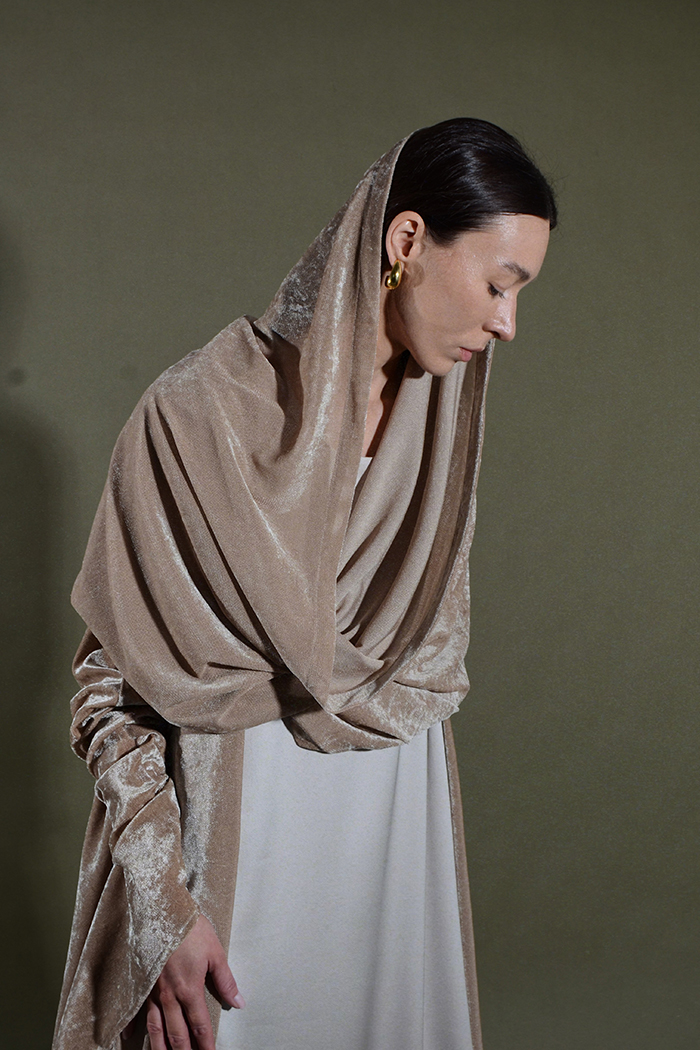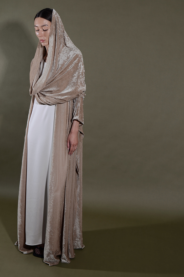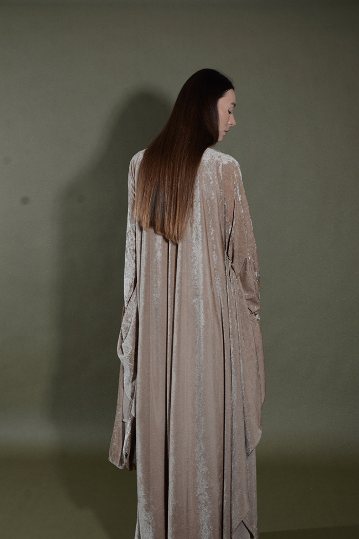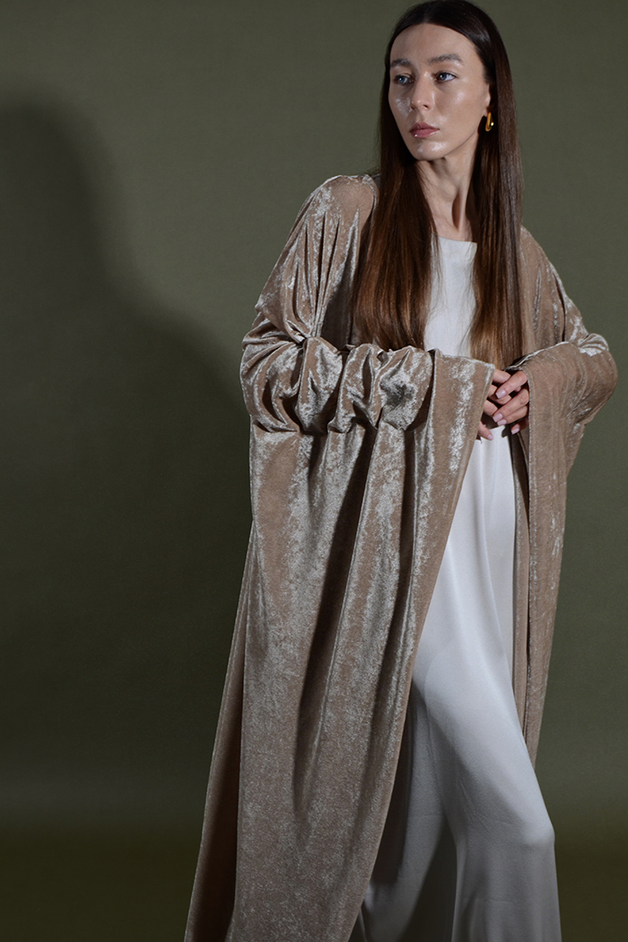 Velvet stretch abaya with ruch sleeves. Includes loop head scarf. This item is made to order, kindly allow 4 – 6 weeks for production and delivery.